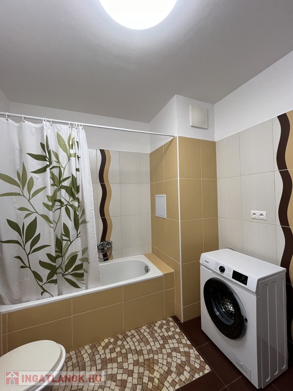 A lakásba lépve egy előszobába jutunk, melyből balra nyílik a káddal és mosógéppel ellátott fürdőszoba.