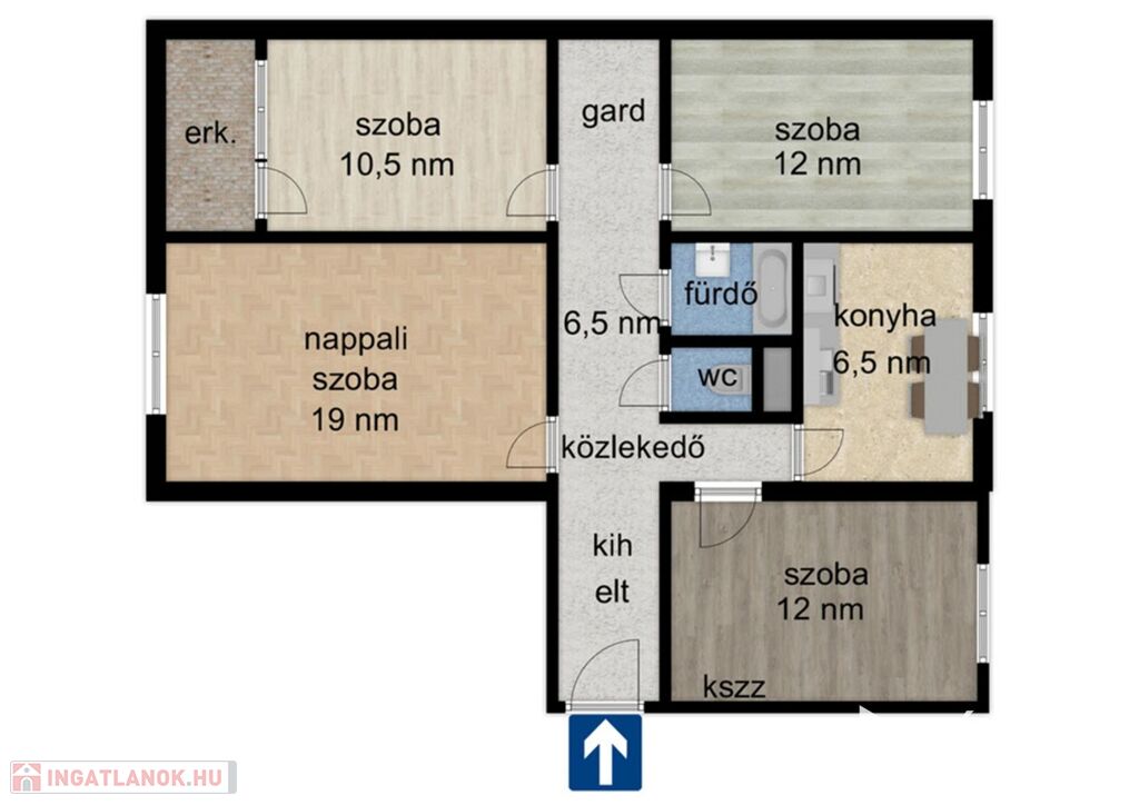 - Nappali, 3.szoba, fürdő, WC, konyha, erkély, kihelyezett előtér.