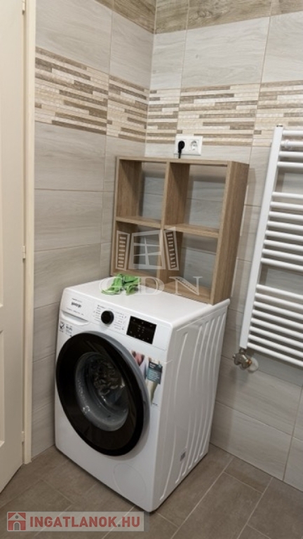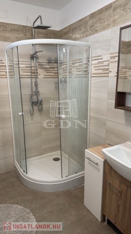 Az előszobában praktikus tároló, a fürdőben zuhanyzó, mosógép és WC található.
