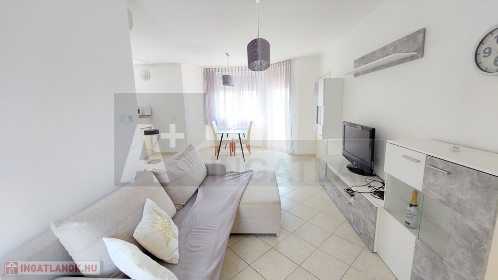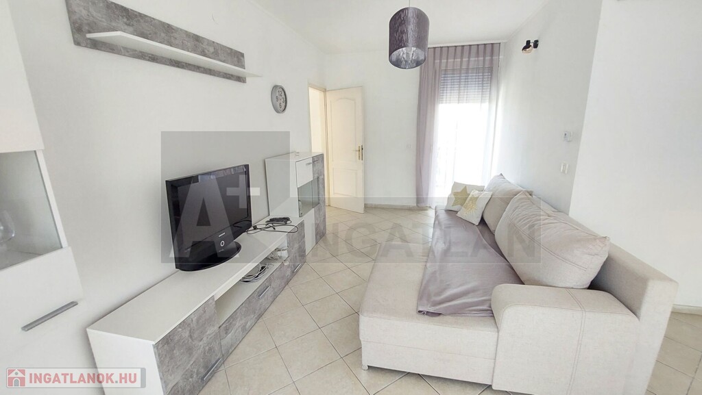 A lakás berendezett és gépesített (hűtő, mikró, mosógép).