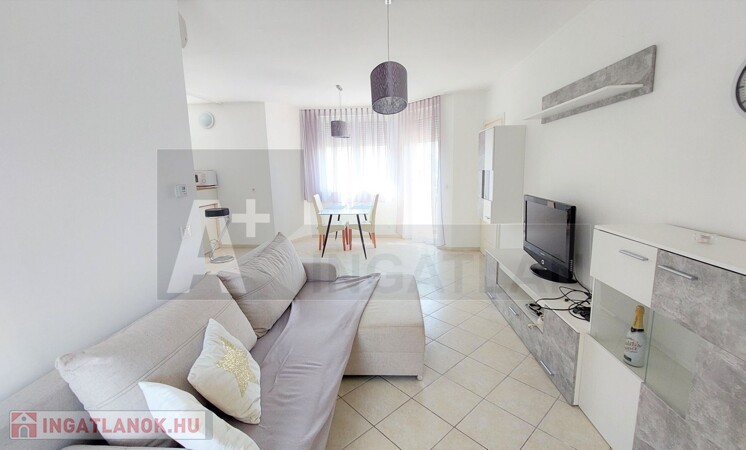 A lakás berendezett és gépesített (hűtő, mikró, mosógép).