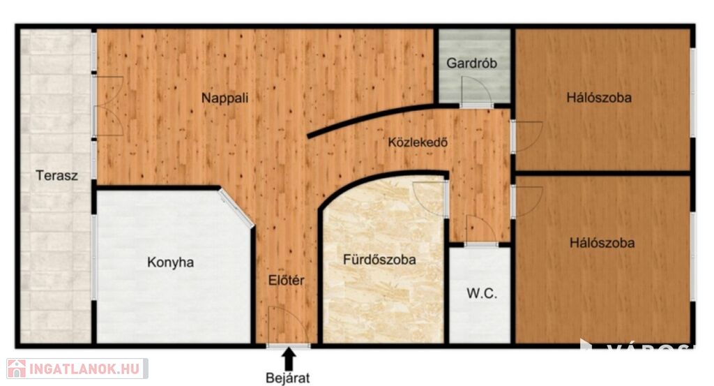 - lakótér: 81 négyzetméter ( előtér+konyha+ nappali+2 hálószoba+ gardrób+fürdőszoba+WC.+terasz)