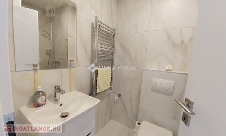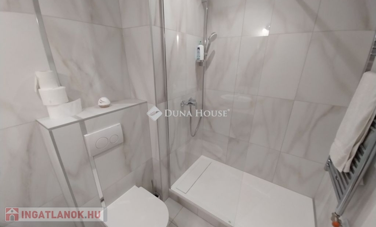 A fürdőszobába zuhanykabin került beépítésre, a mellékhelyiség nem szeparált.