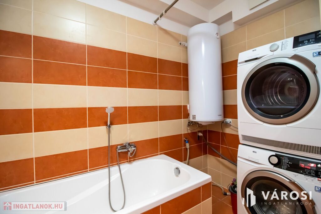 A lakásban a konyha gépesített, mosogatógéppel, mikróval és hűtőszekrénnyel is rendelkezik. A lakás a képeken látható bútorokkal kiadó. A szobákban és az előszobában is egy-egy beépített gardrób nyújt lehetőséget a tárolásra. A fürdőszobában mosó és szárítógép is található.