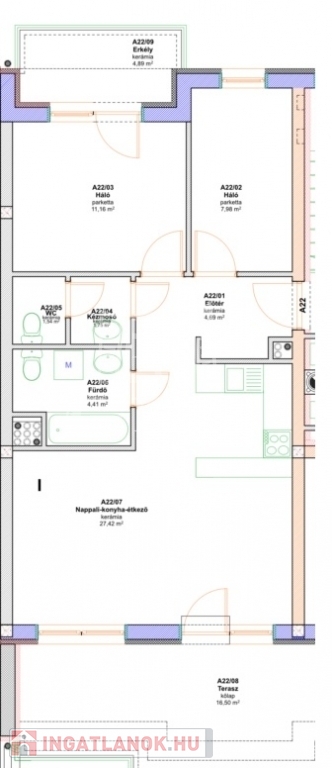Az ingatlan gépesített konyhával (hűtőszekrény, mosógatógép, indukciós főzőlap, villanytűzhely, páraelszívó), két hálószobával + nappalival + 2 db nagy terasszal rendelkezik, összesen 70 m2.
