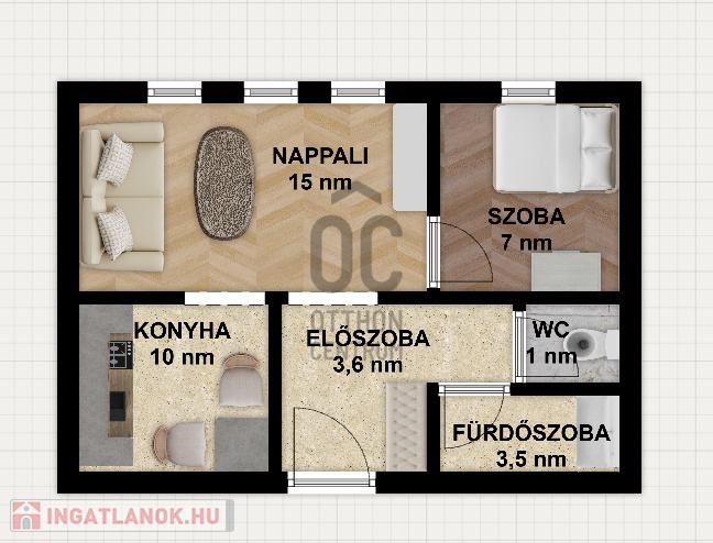 A helyiség világos, jól tagolt: nappali, hálószoba, konyha és fürdőszoba található benne.