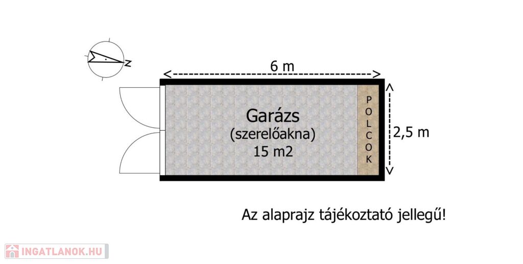 A garázs belső végében teljes szélességben kiépített polc, szekrény található a szerszámok, ritkábban használt dolgok tárolásához.