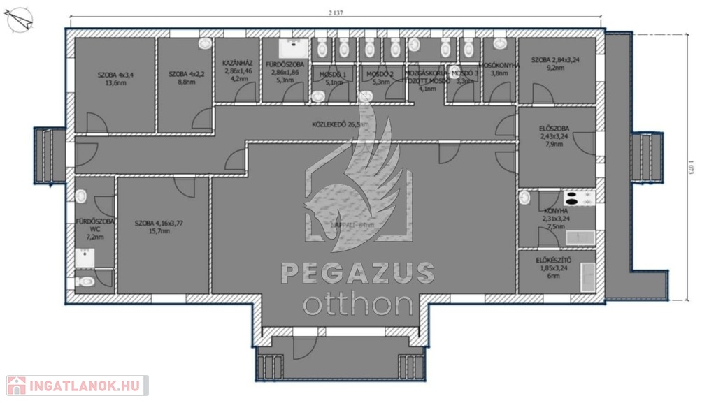 4 szoba, hatalmas nappali, üzemi konyha méret, 6 vizesblokk, tárolók, és kitűnő gépészet van.