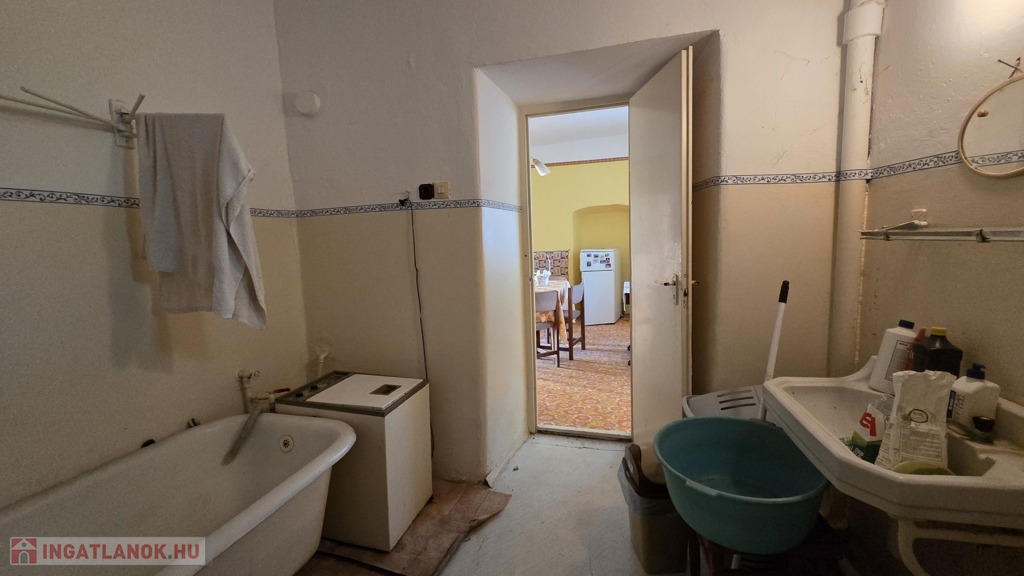 A tágas konyhából nyílik a fürdőszoba WC-vel, onnan egy tároló és a kazánház. A tárolóból juthatunk fel a padlásra.