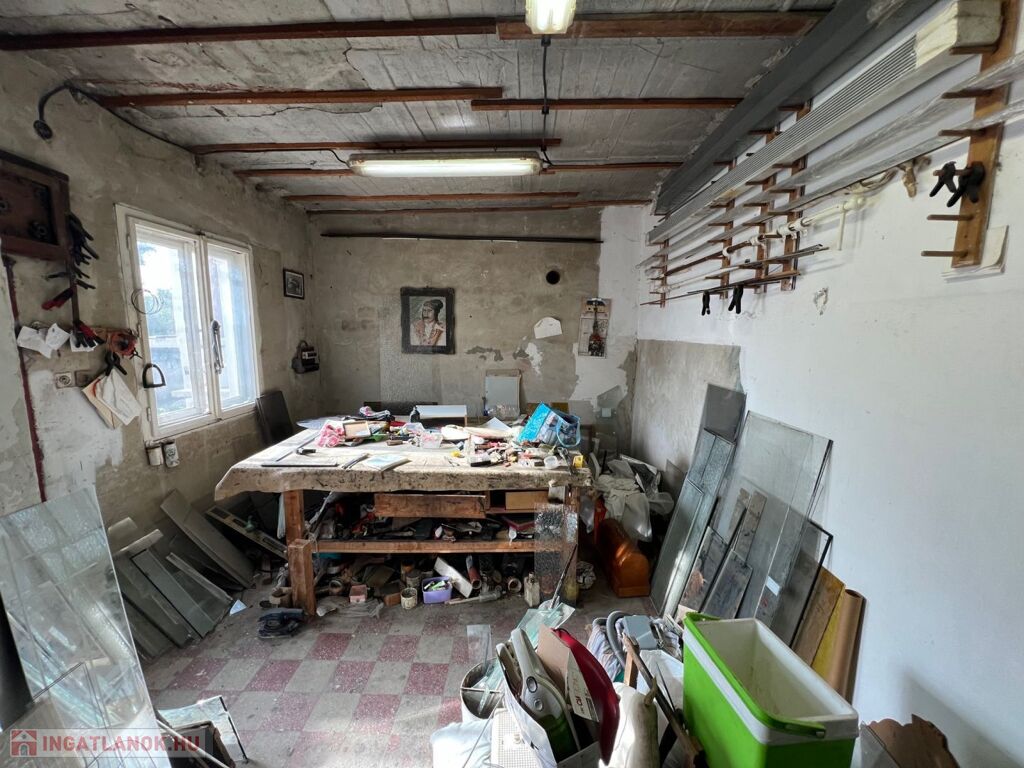 A műhely mellett 16,4 m2-es garázs található, felette pedig egy hobby szoba.