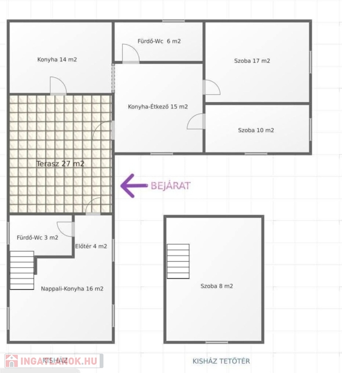 A ház alapterülete 62 nm, 2 és fél szoba, konyha, fürdőszoba, amelyhez egy 27 nm terasz is tartozik, ami egy 31 nm téliesített faházhoz kapcsolódik, ebben található szoba, konyha, nappalival és fürdőszoba, alatta 16 nm pince. A telek 2809 nm, aminek a hátulsó része gazdálkodásra is alkalmas. A ház fűtéséről gázkazán gondoskodik, így a téli hónapokban is kellemes a meleg.