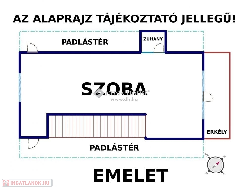 Az emelet pedig jelenleg egy nagy méretű erkélyes szobából és egy kisebb zuhanyzóból áll, emellett a pakolás céljára alkalmas padlástér is innen érhető el.