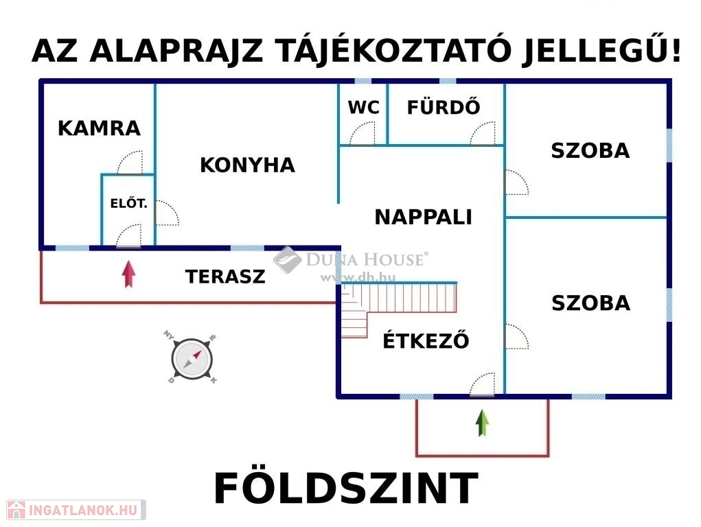 Helyiségeket tekintve a földszinten kialakításra került 2 darab hálószoba, nappali, konyha kamrával, étkező, fürdő külön WC-vel és egy kis előtér.