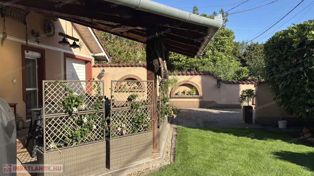 Kényelmes parkolás,garázsban és fedett kocsibeállóban. Szépen rendezett,karbantartott udvar.