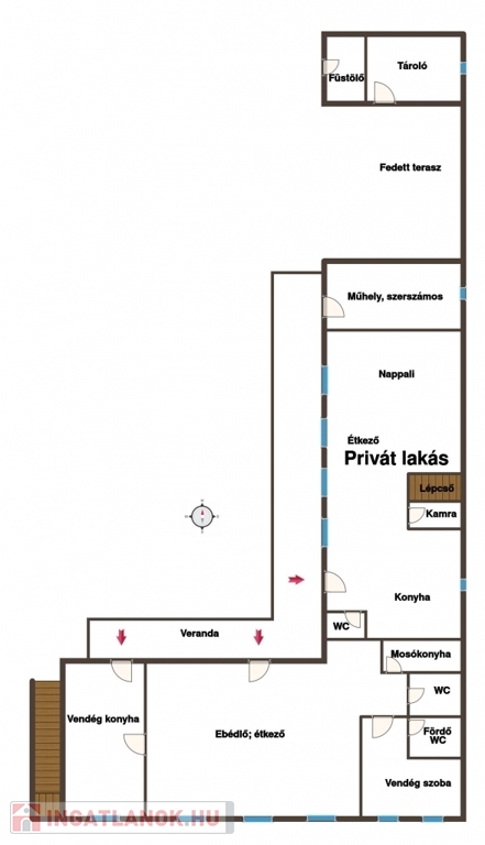 Privát lakótér: 3 szoba + nappali + dupla komfort (összesen 100 m²), modernizált, külön bejárattal