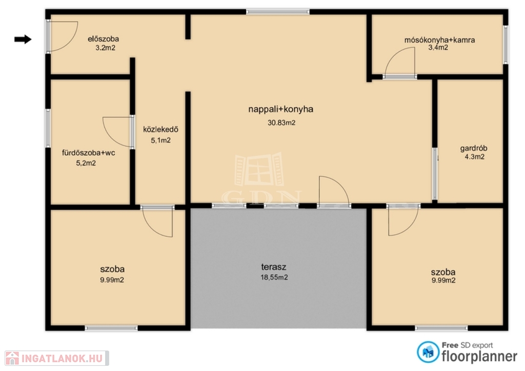 - Tágas nappali–étkező–konyha egybenyíló térrel