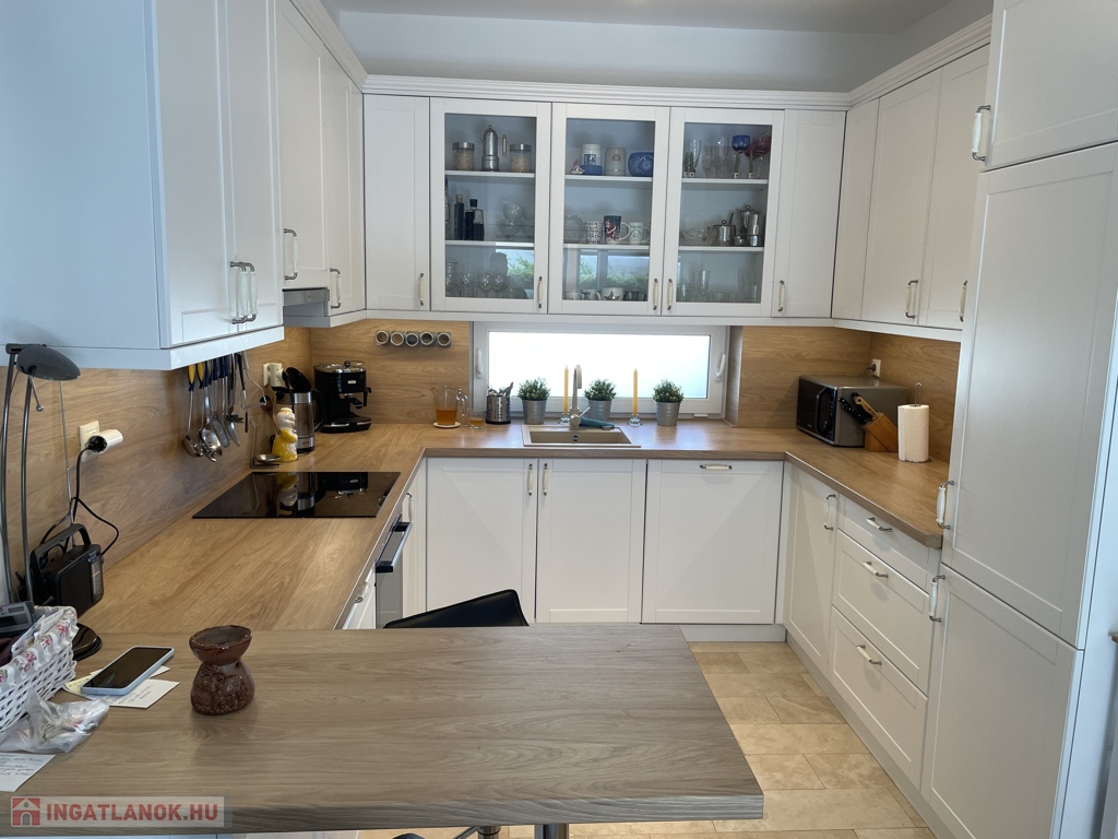 A földszinten található tágas, napfényes nappali–konyha–étkező egy légtérben helyezkedik el, közvetlen teraszkapcsolattal. A kert felé nyíló tér természetes módon köti össze a belső életteret a szabadtéri pihenéssel – nyári vacsorákhoz, baráti beszélgetésekhez vagy egy nyugodt balatoni estéhez ideális választás. A kerti terasz elektromos árnyékolóval felszerelt, így a legmelegebb napokon is kellemes marad.