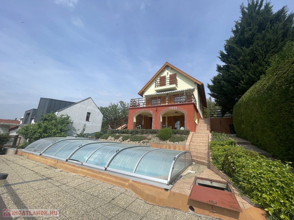 A két nagyméretű, panorámás terasz (22 m2 és 16 m2) valódi kiterjesztése a lakótérnek - reggeli kávéhoz, esti borozáshoz, vagy egyszerűen a látványhoz. A kertben egy 8×4 méteres, fedéssel ellátott medence kapott helyet, amely tovább emeli az ingatlan nyaralóhangulatát.