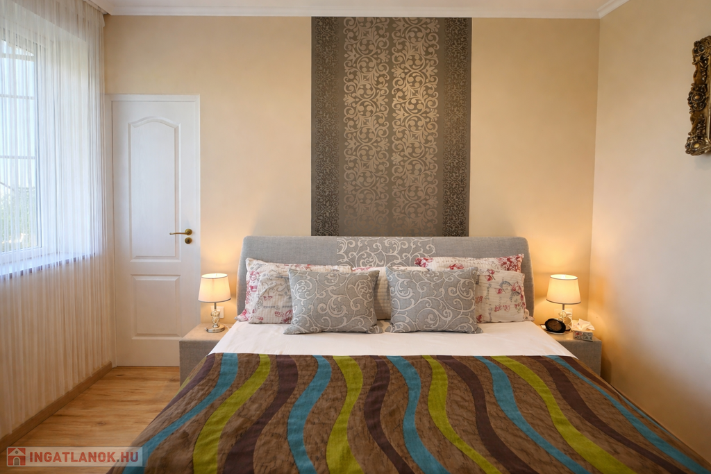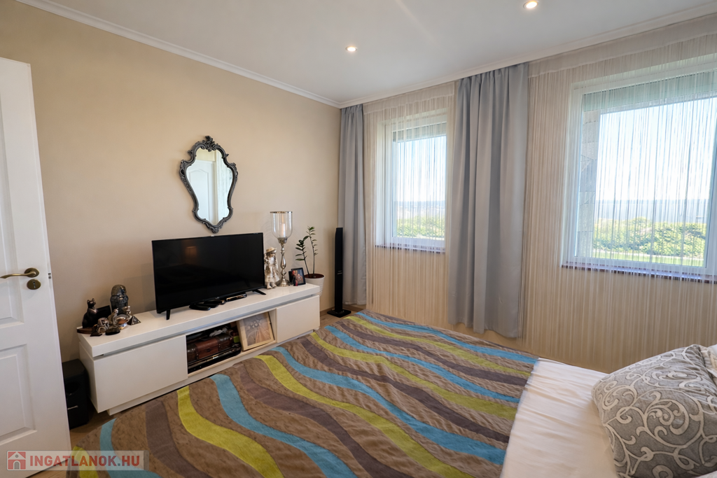 Az ingatlan praktikus elrendezésű: tágas nappali és 5 külön nyíló hálószoba biztosítja a kényelmes életteret család és vendégek számára egyaránt. A fürdőszobában jacuzzi is található.