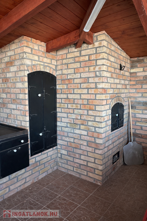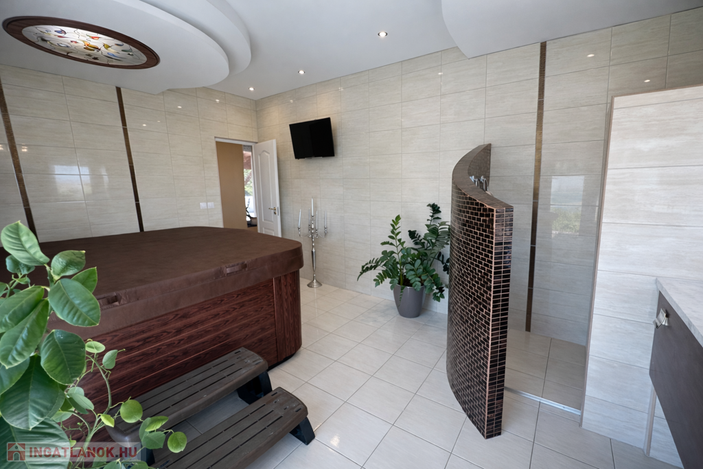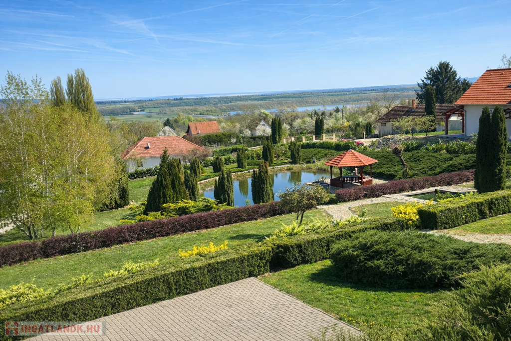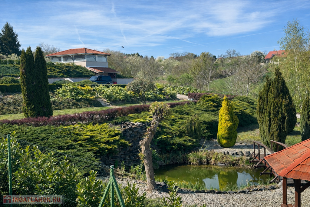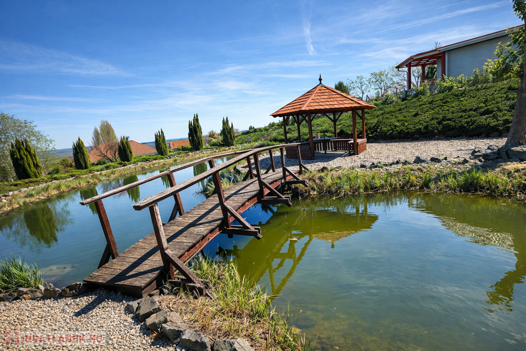 A gondozott kert számos lehetőséget kínál a pihenésre: 120 m²-es grillterasz, kerti sütögető, valamint egy hangulatos, 45 m²-es fedett kerti pavilon áll rendelkezésre. Emellett egy fedett medence is kialakításra került (10 × 4 m, kb. 1,5 m mély), amely üvegtetővel lefedhető, így szinte egész évben használható. A kertben dekoratív tó, saját kút és automata öntözőrendszer is helyet kapott.