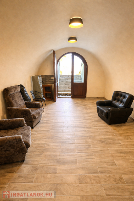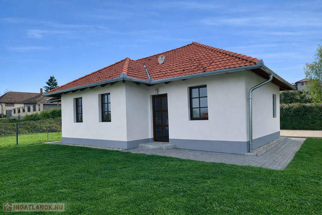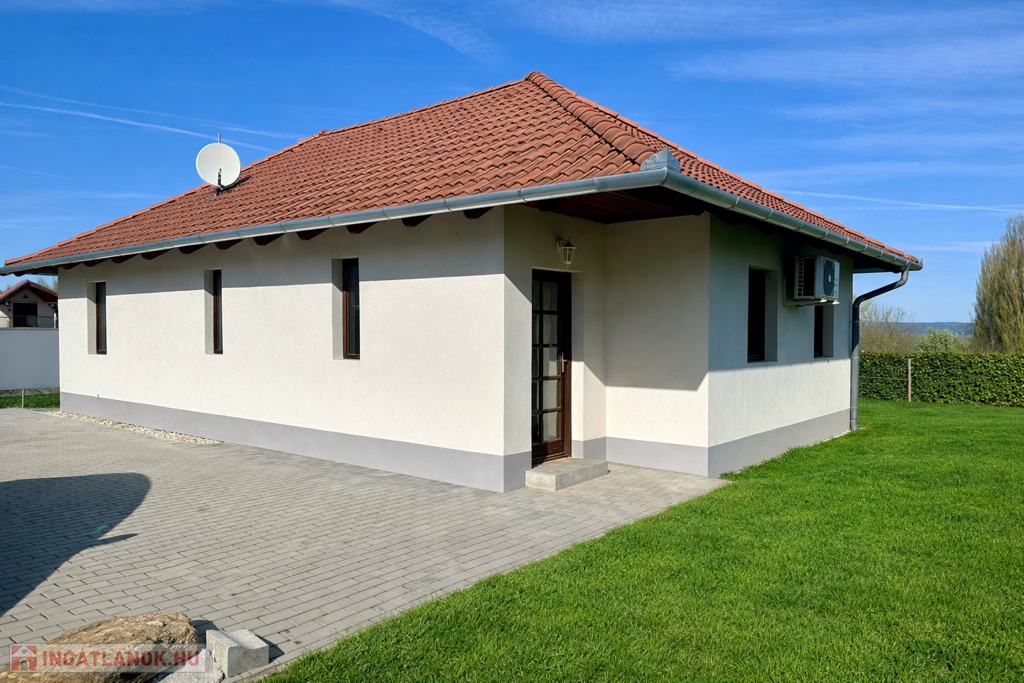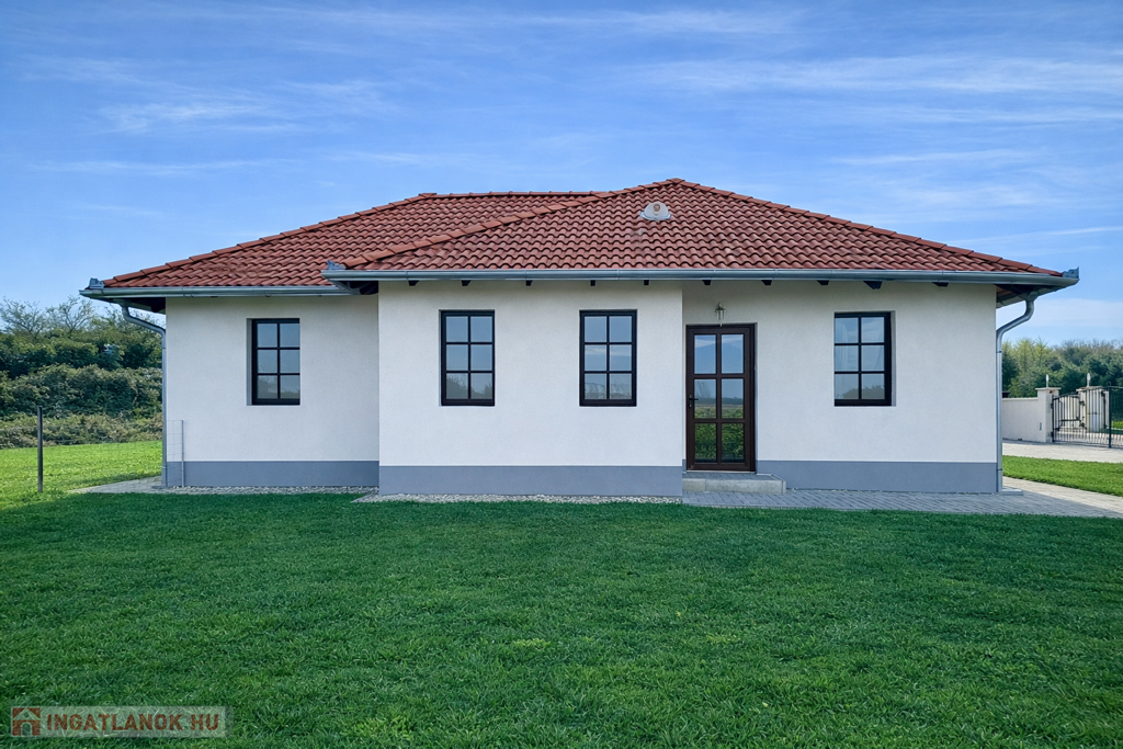 A ház egyszintes, nettó 90 m² lakóterülettel rendelkezik, amelyhez egy 45 m²-es földszinti pince (borospince) és egy fedett tároló is tartozik. A belső elrendezés modern és praktikus: amerikai konyhás nappali, 2 külön nyíló szoba, gardróbszoba, fürdőszoba, valamint külön WC.
