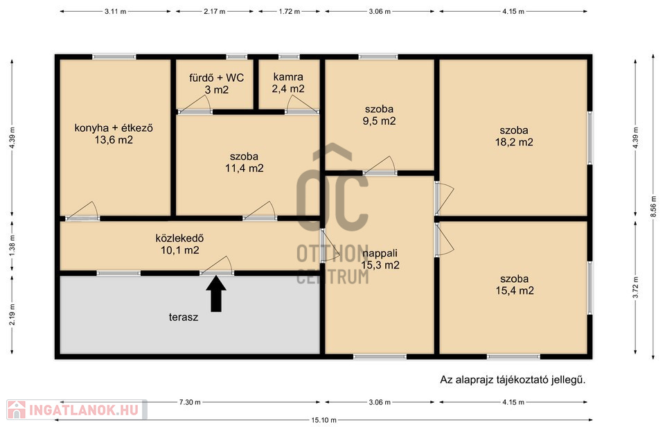 4 külön nyíló szoba, tágas nappali, konyha-étkező, fürdő–WC, kamra, közlekedő és egy kellemes terasz alkotja