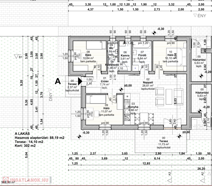 Elrendezés és helyiségek méretei: előszoba: 5,64 m², nappali: 29,24 m², konyha: 5,30 m², szoba 1: 12,28 m², szoba 2: 10,04 m² szoba 3: 9,66 m², fürdőszoba: 5,82 m², külön WC: 1,50 m², kamra: 2,96 m²,