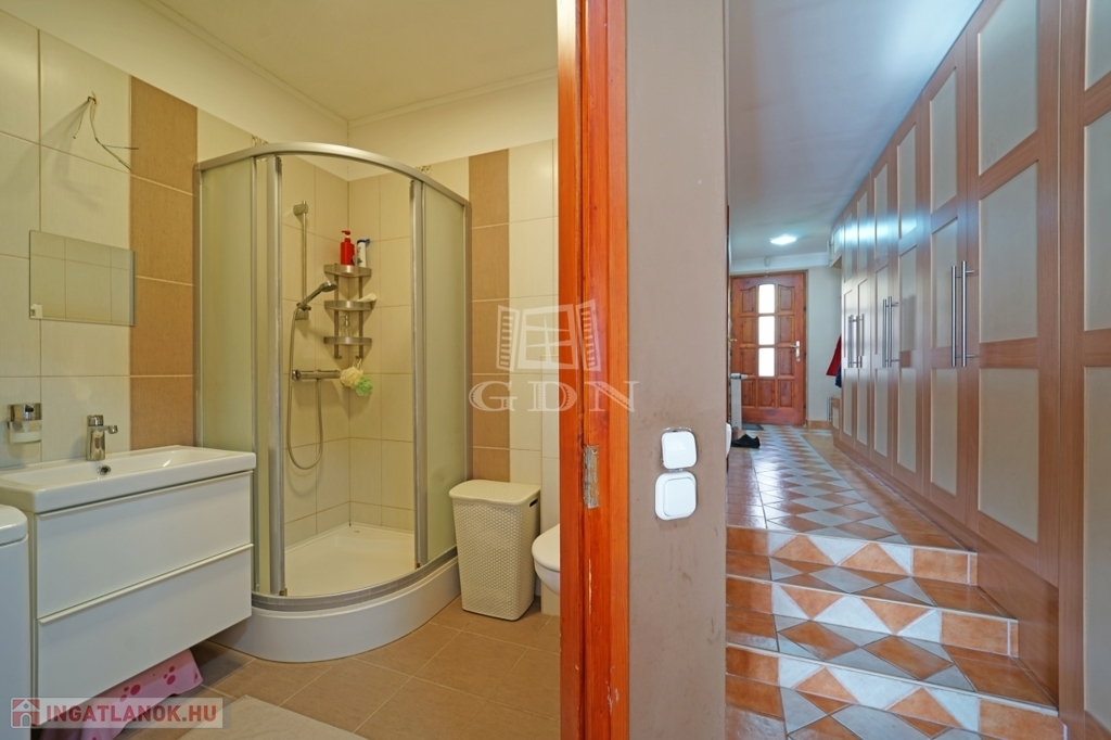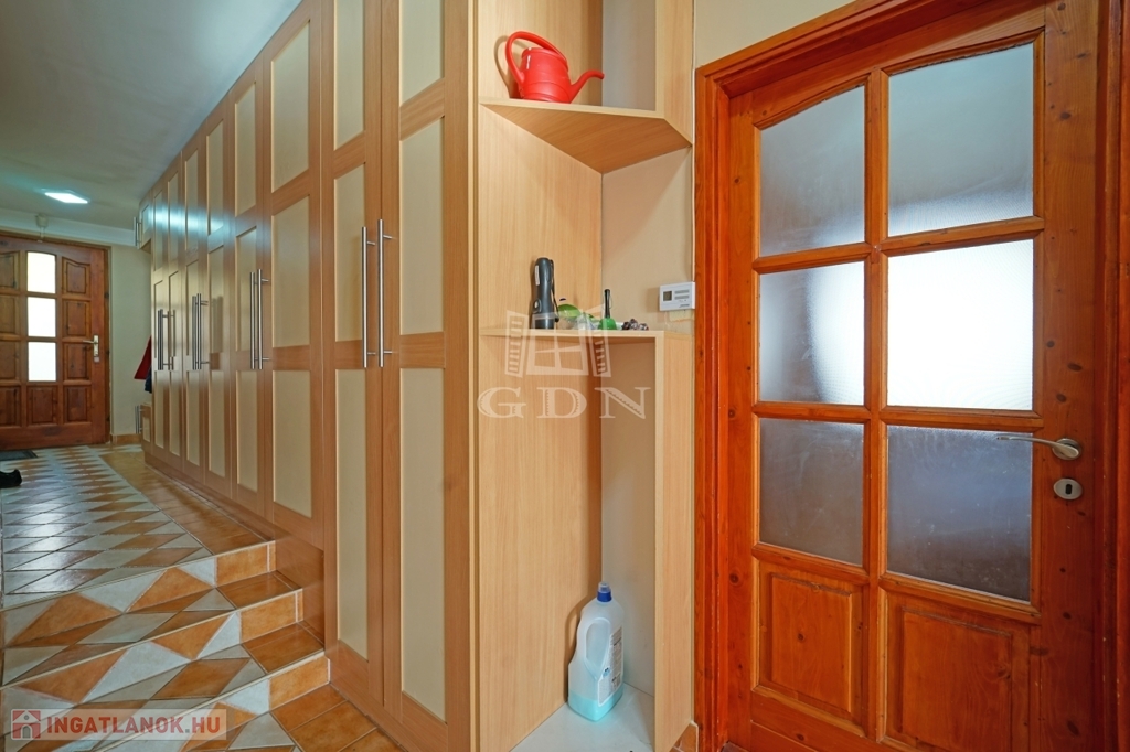 A felső lakás 136 m2-es, ami magába foglalja a két fűtött garázst is (19,4, 25,4m2), melyek elektromos garázsajtóval lettek ellátva.