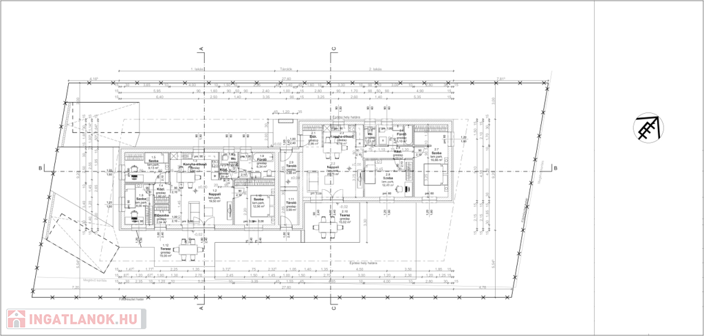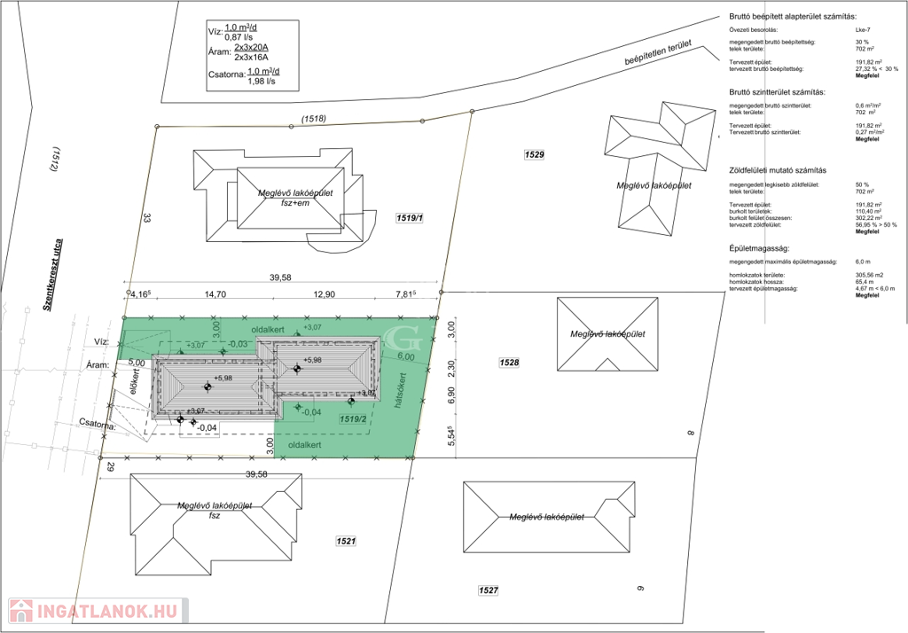 Az utcafronti 3 szoba + nappalival rendelkező ikerfél telekterülete 240 m2, a hátsó 2 szoba + nappalival tervezett ingatlan telekterülete 462 m2.