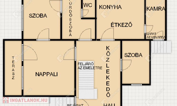 - előszoba, közlekedő, konyha-étkező, kamra, fürdőszoba, wc külön, nappali, két kényelmes méretű szoba