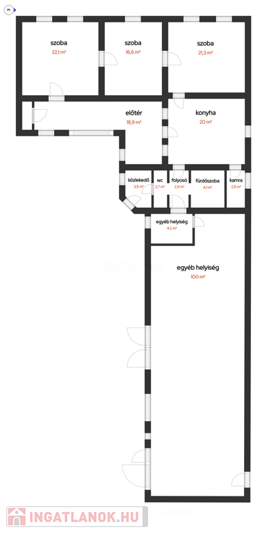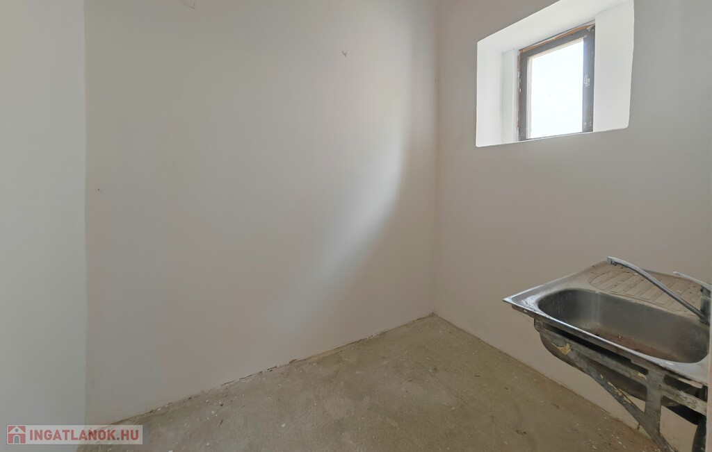 A 120 m2-es lakótér 3 benapozott szobával és nagy alapterületű konyhával rendelkezik, utóbbi kialakítása a vevőre vár.