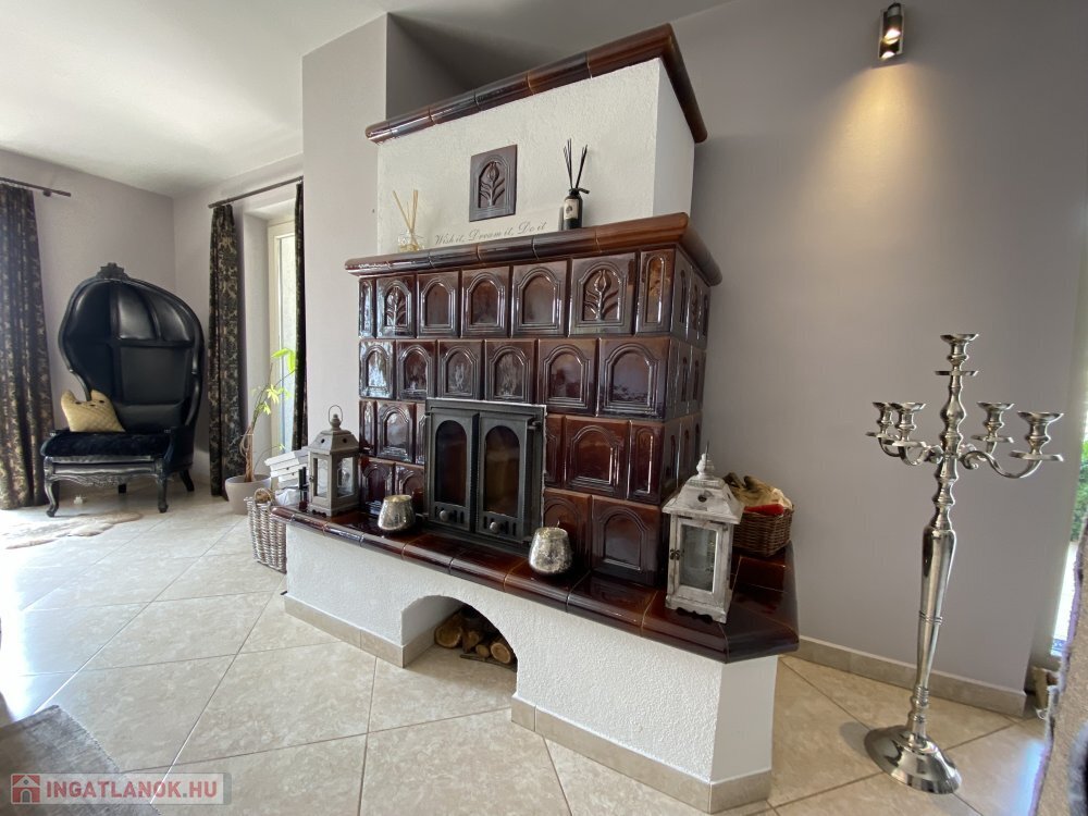 A nappaliban található egy cserépkályha, ezenkívül innen nyílik a 150 nm-es balatoni panorámás terasz, melyhez egy kültéri konyharész, pizzasütő kemencével lett kialakítva.