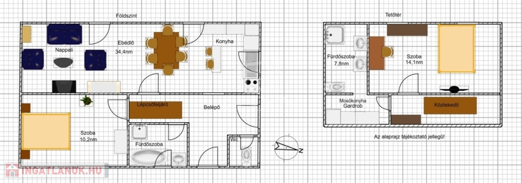 Földszint: nappali–étkező, konyha, 1 szoba, fürdőszoba, külön WC, előtér