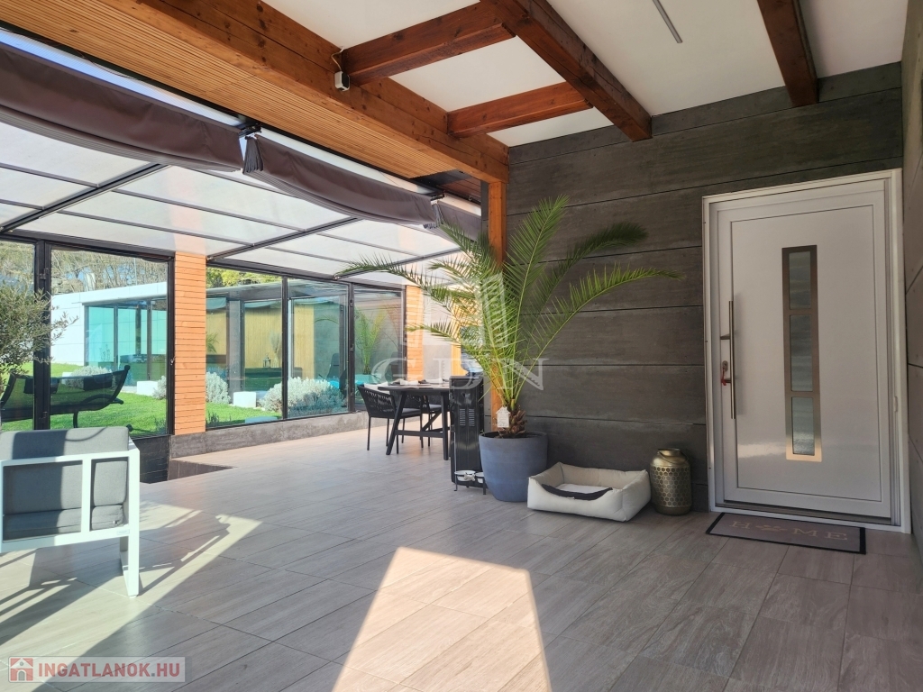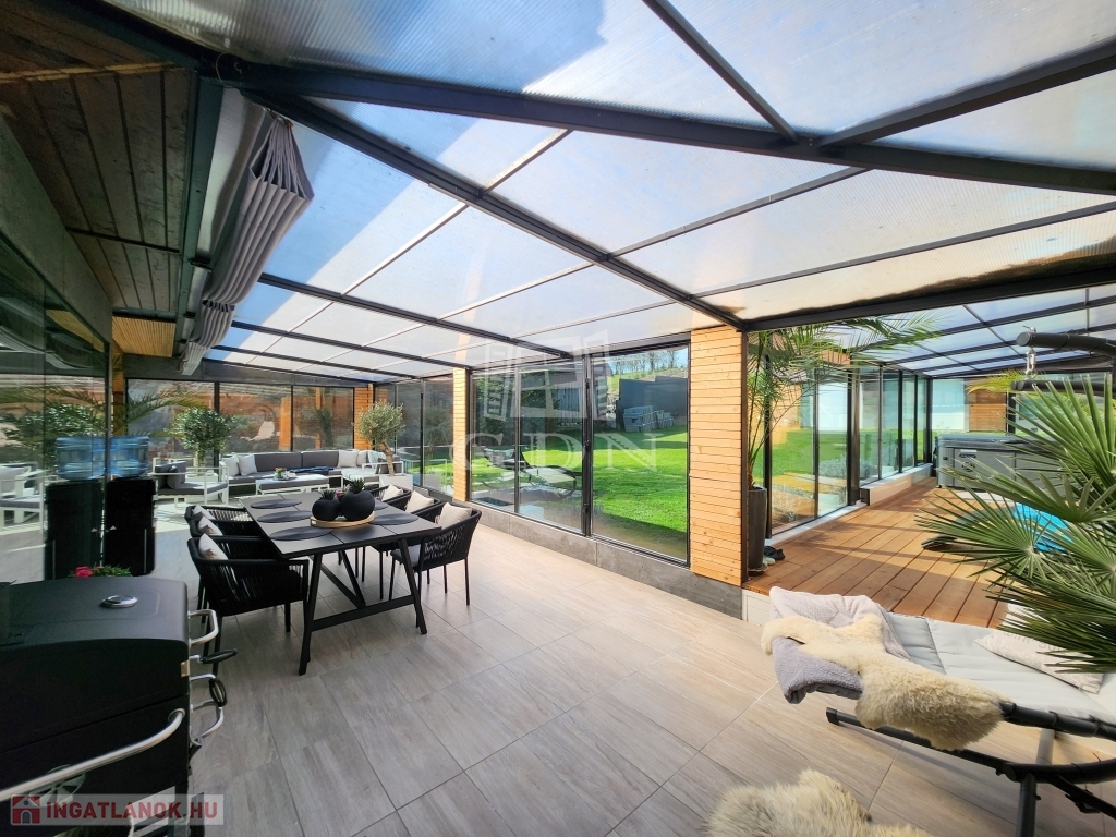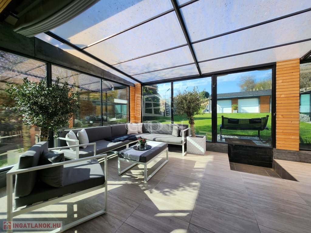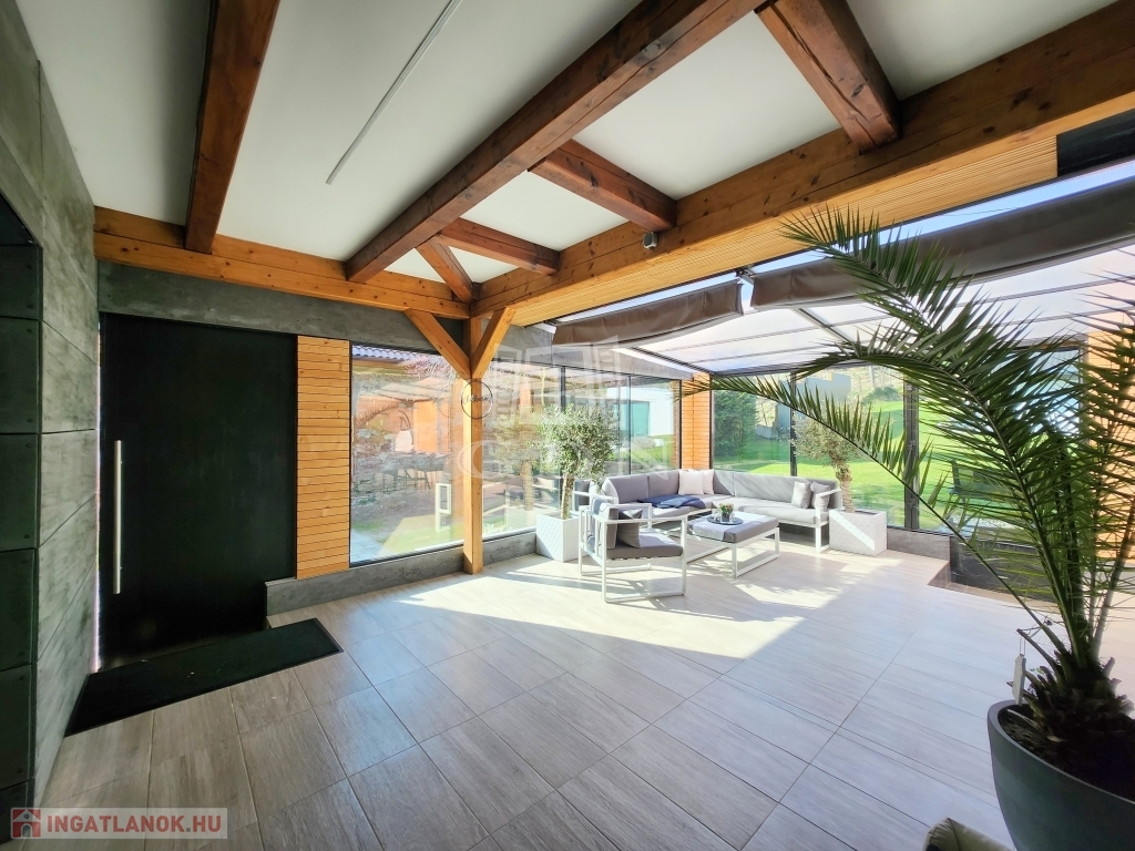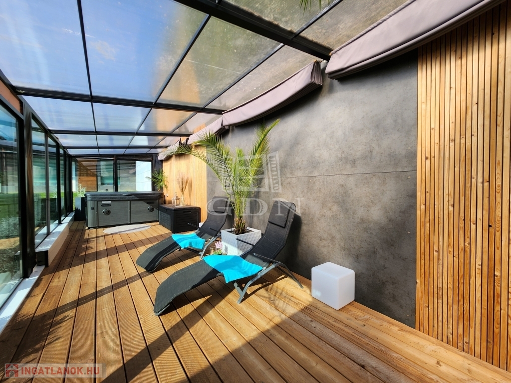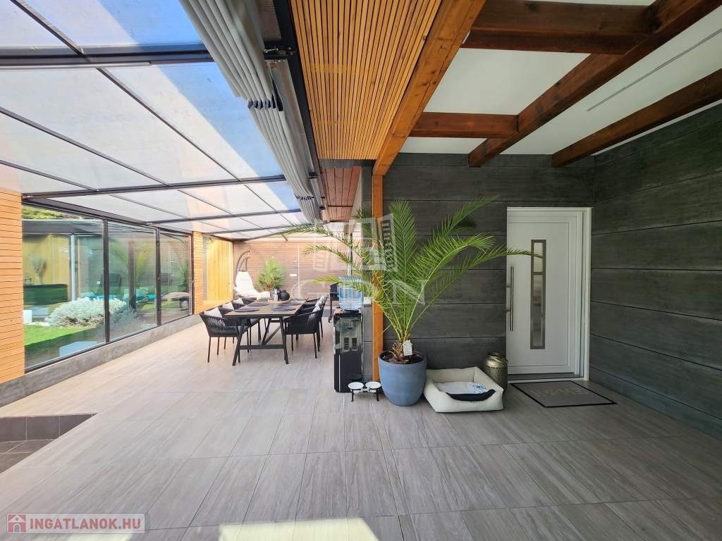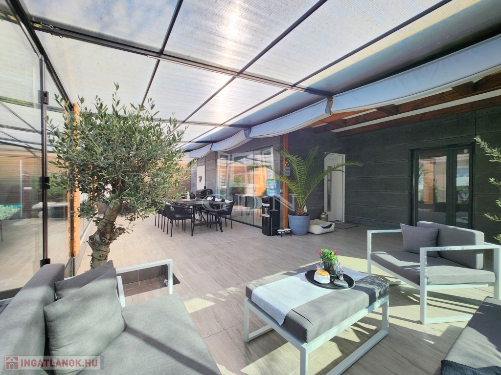 Csendes, árnyékolókkal ellátott 80 m2-es terasza pihenésre, családi összejövetelekre, kikapcsolódásra " született". Óriás üvegfelületei, kertre néző kilátása és a nyugalom, amely árad belőle, páratlan érzést képes nyújtani!