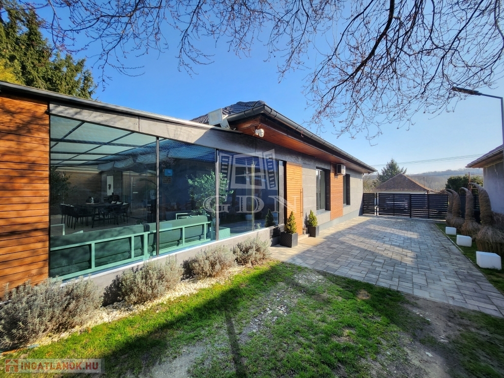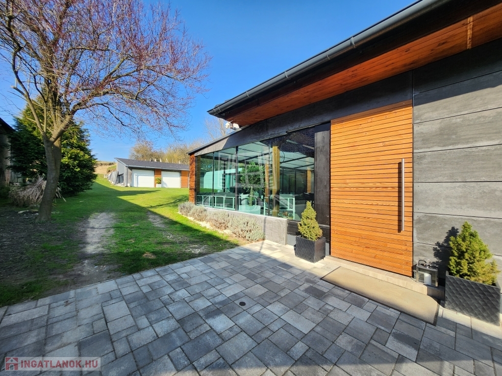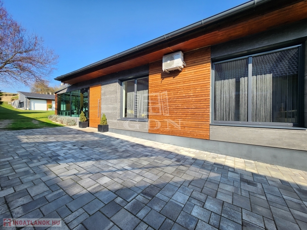 Az ingatlan 120 m2 nagyságú, nappali - konyha - étkező együttes és kettő háló kialakítású, 80 m2 terasszal, dupla garázzsal, melynek folytatása a panorámás 3539 m2 nagyságú birtok felső része.