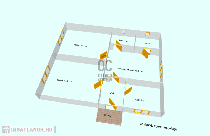 Az épületbe egy kicsi teraszon át léphetünk be, amire pár lépcső vezet. Az előszobából nyílik balra az egyik szoba, jobbra a félszoba és szemben pedig a konyha-étkező helyiség. Innen tudjuk megközelíteni a másik nagy, világos szobát, a kádas fürdőszobát, valamint a kamrát, ami egyben a padlásfeljáró is. Ezek a helyiségek akár összenyithatóak is, így kialakítva egy tágas fürdőt, vagy külön megoldható a toalett-kézmosó, de ne rám hallgasson, hanem engedje szabadon a fantáziáját úgy, hogy élőben látja!