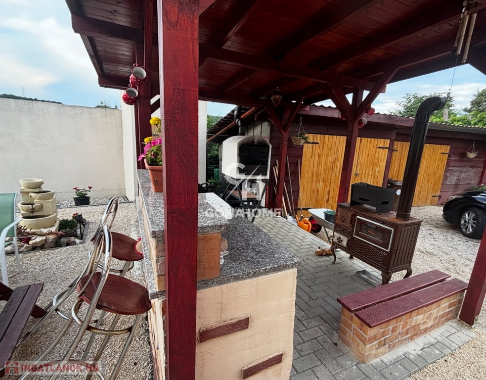 A kert praktikusan felszerelt: kialakításra került 2 kerti csap, valamint egy fúrt kút, amely vízkiemeléses szivattyúval működtethető, így az öntözés és az állattartás vízellátása költséghatékonyan megoldható. A hangulatos mini kemence és sparhelt a vidéki életérzést és az önellátó életmód lehetőségét erősíti.