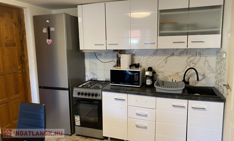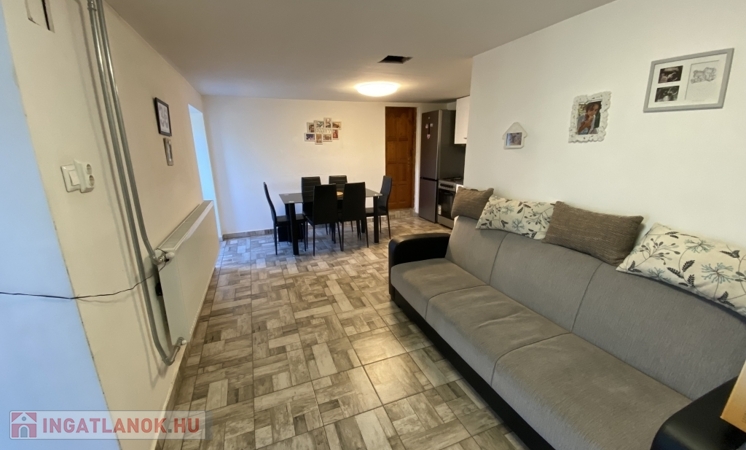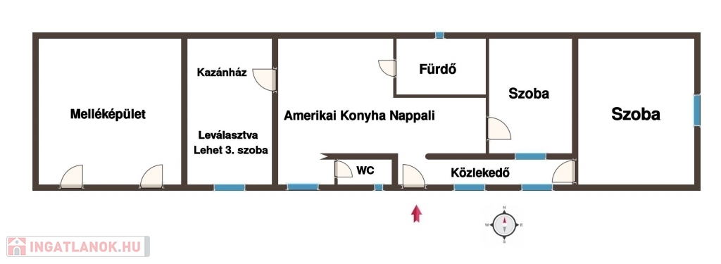 Ingatlan elosztása, amerikai konyha nappali, 2 szoba, fürdő, külön wc, előszoba, közlekedő, kazánház.