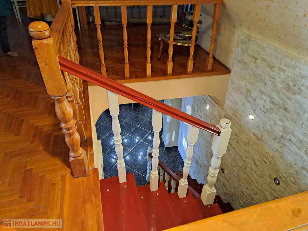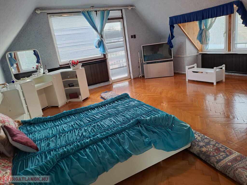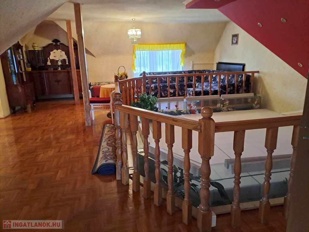 A földszintről kényelmes lépcsőn juthatunk a tágas emeleti részbe, ahol 2 hálószoba található, valamint egy hatalmas, tágas emeleti társalgó/nappali is. Az egyik hálószobát mérete alapján akár lakrésznek is nevezhetjük. Az emeleti fürdőszobát bátran tekinthetjük wellness részlegnek is, mert ott lett kiépítve egy fürdőmedence és található benne egy a masszázskád is.