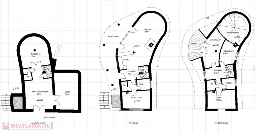 - Az emeleten 3 szoba található, egyikből terasz nyílik a Balatonra, egy másik szobából pedig a lenti nappalira látunk rá. Valamint fürdő és WC, közlekedő kapott még helyet.