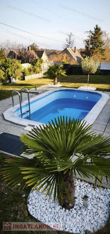 - ápolt, parkosított kert 2022-ben épült medencével, több autó számára is kényelmes térkövezett parkolóhellyel, fedett beállóval, garázzsal, tárolóval, locsolási vízmérővel
