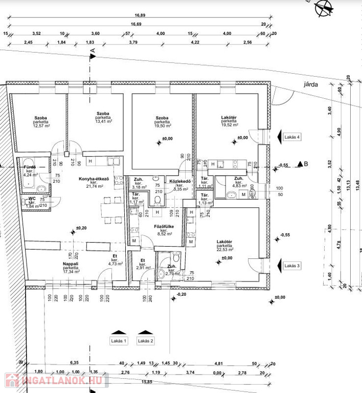 Az alsó szinten a tervek szerint 4 lakás lett kialakítva, ahol a belső falak már állnak, így a vásárló könnyen befejezheti az építkezést.