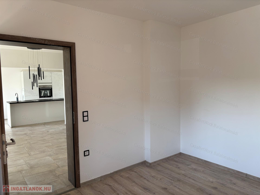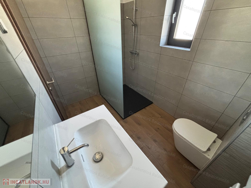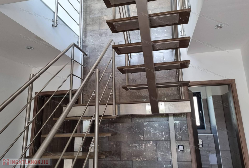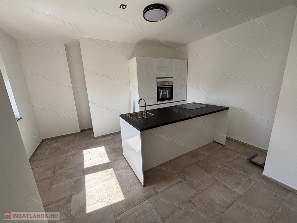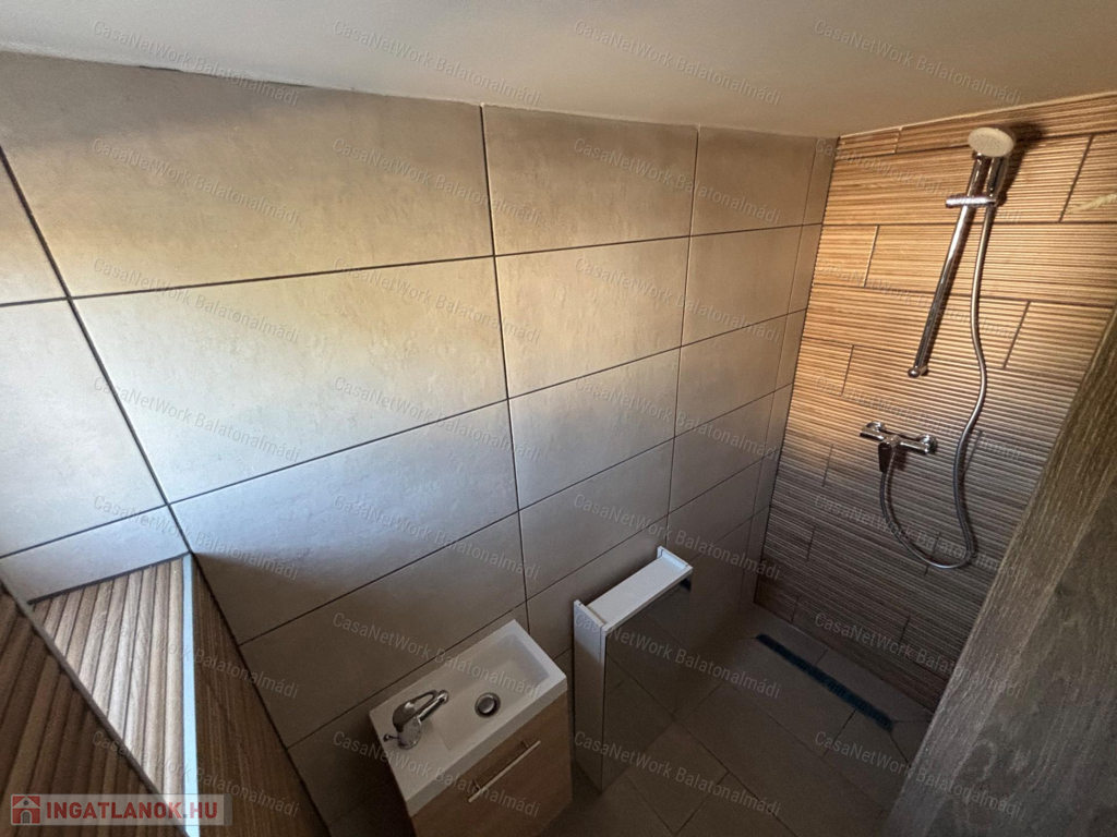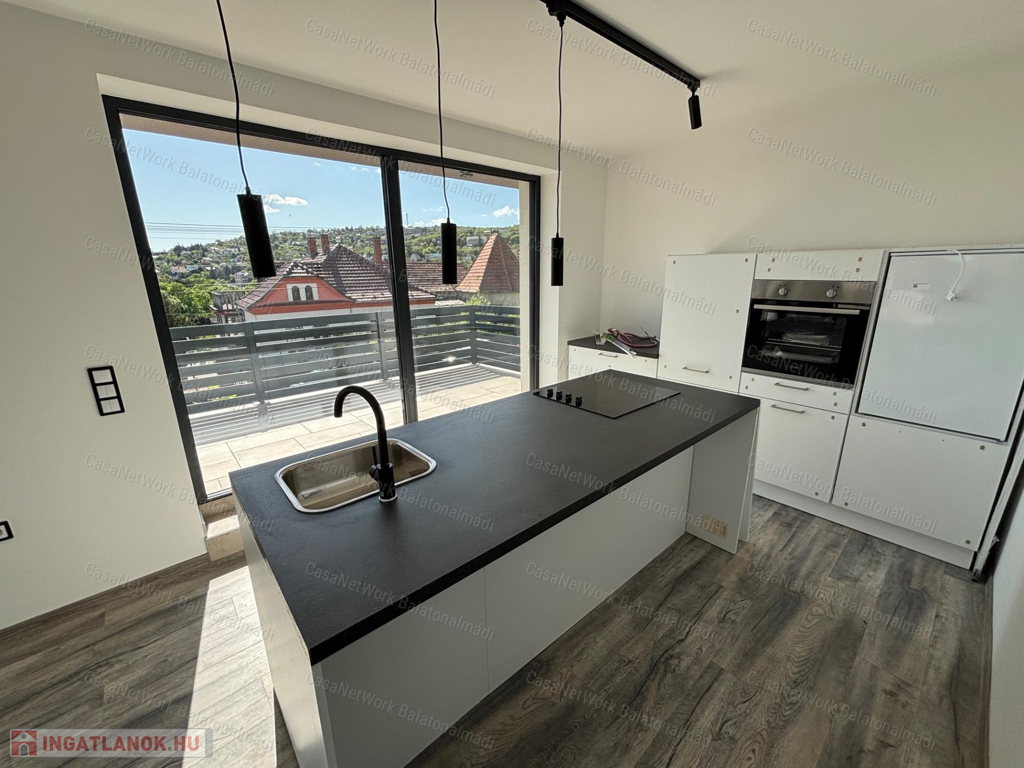 - emelet: egy szoba, fürdőszoba és toalett, panorámás, amerikai konyhás nappali, a különleges, 76 nm-es erkélyhez kapcsolódva, ahonnan elbűvölő a kilátás az Öreg-hegyre, a Fűzfői-öbölre és a túlpartra is