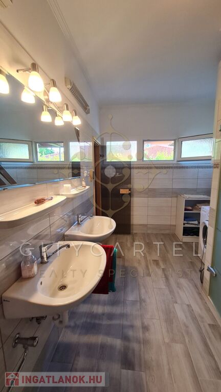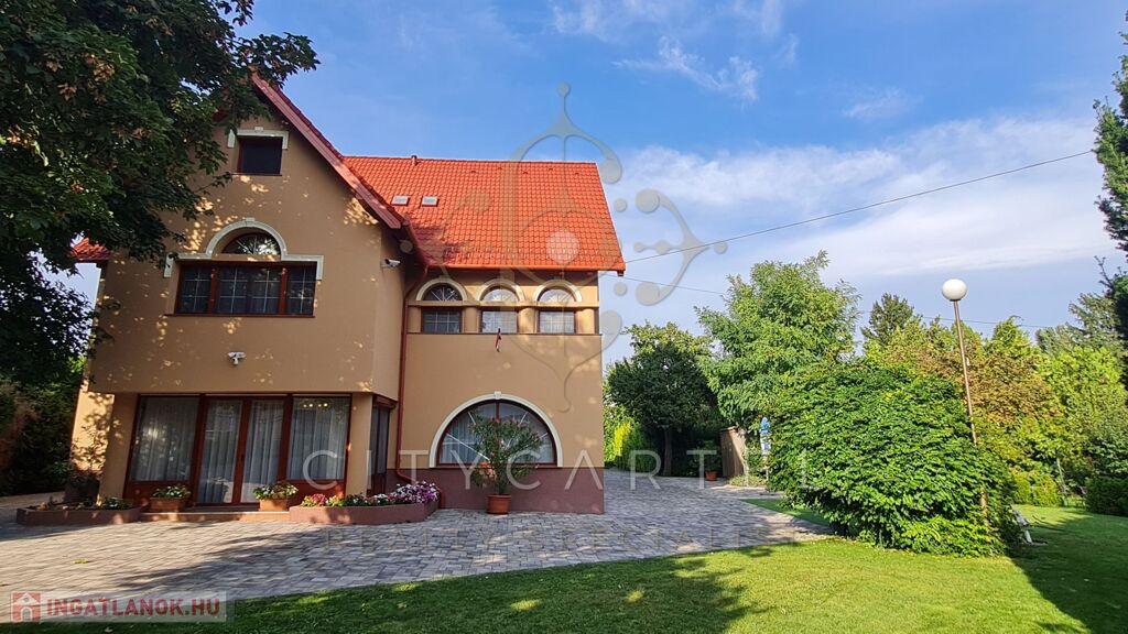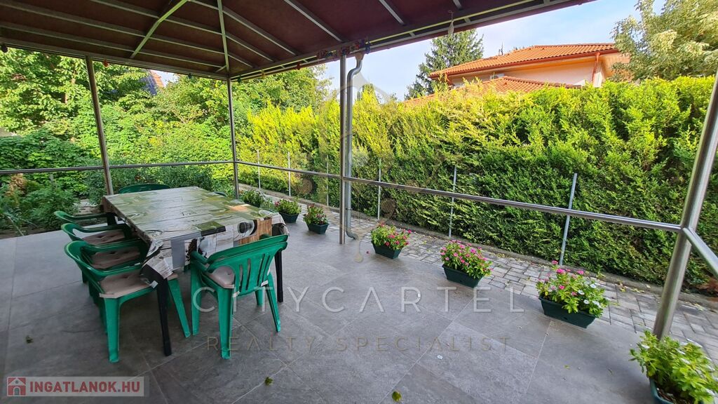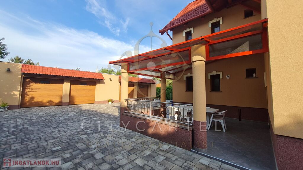 A kert egy része térkövezett, a másik parkosított, gondozott. Kerti tó árasztja a nyugalmat! A tulajdonos nagy hangsúlyt fektetett a minőségi anyagok használatára, a részletek kidolgozására!