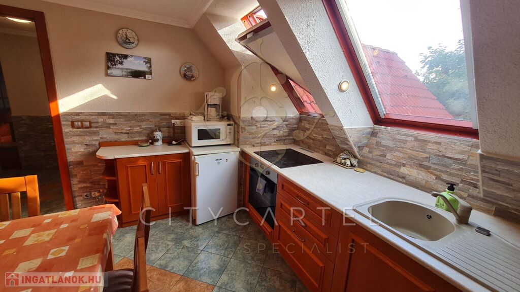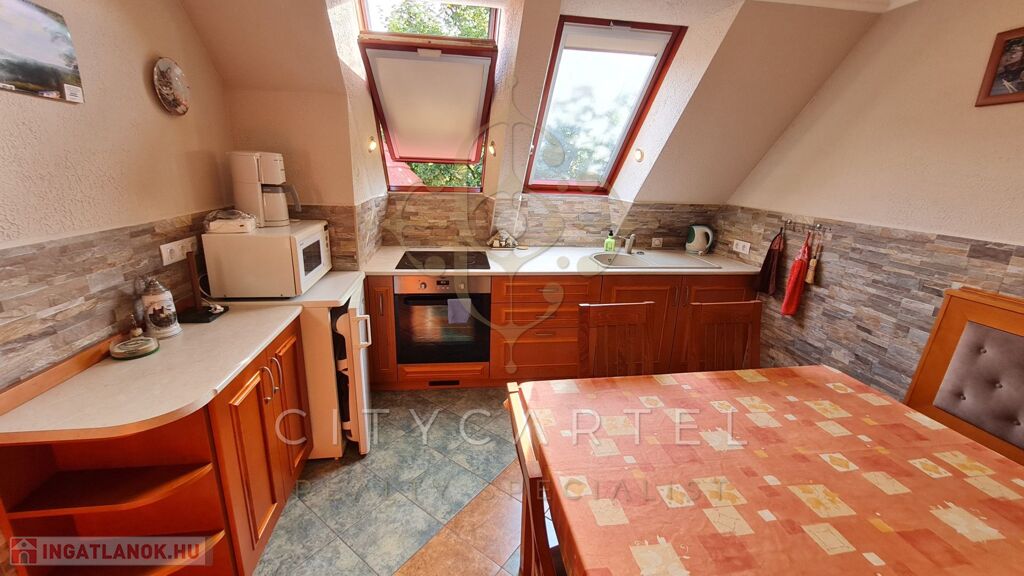 Második szint: nappali, hangulatos elektromos kandallóval, konyha, két hálószoba, gardrób, fürdőszoba.