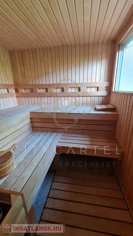 Külön épületben a garázs, tároló, modern konyha, nappali, szoba, biliárdszoba, konditerem jakuzzival, szauna két zuhanyzóval.