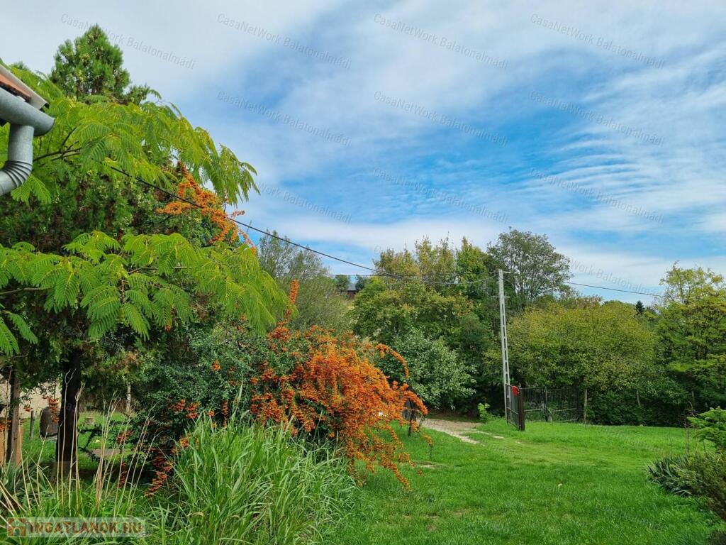 - a gondozott portát két részre osztották: a családi ház melletti füvesített udvaron helyezkedik el a kerti játszótér, a szabadtéri bútorok, a fedett autóbeálló kettő autó részére, a virágoskert... minden, ami egy kényelmes otthonhoz kell; az elkerített távolabbi telekrész erdővel büszkélkedik; az emeletről és a birtok felső részéről is lenyűgöző a balatoni- és tájpanoráma