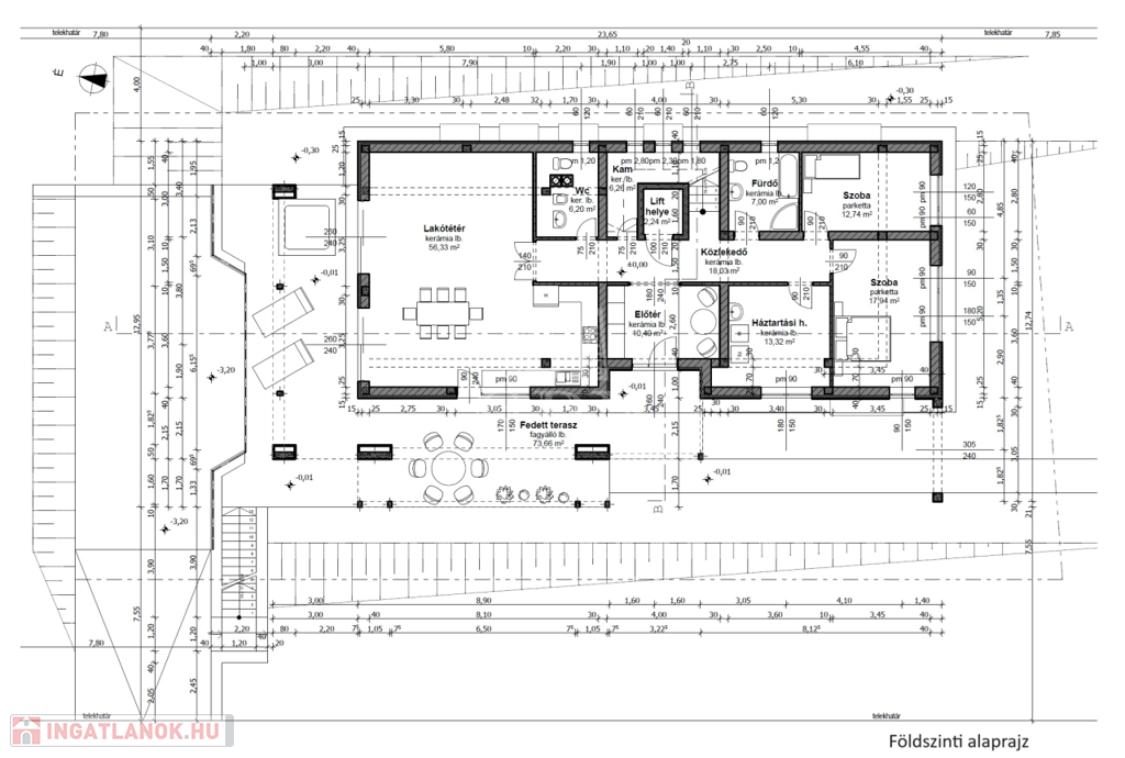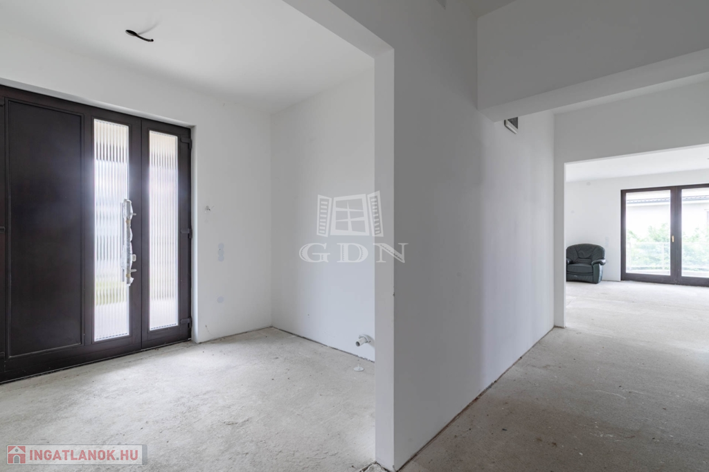 A 150 nm-es nettó alapterületű földszinten nagyméretű előszoba, 1 amerikai konyhás nappali, 2 hálószoba, 2 fürdőszoba, háztartási helység, kamra található. Körbe fedett 73 nm-es terasszal rendelkezik.
