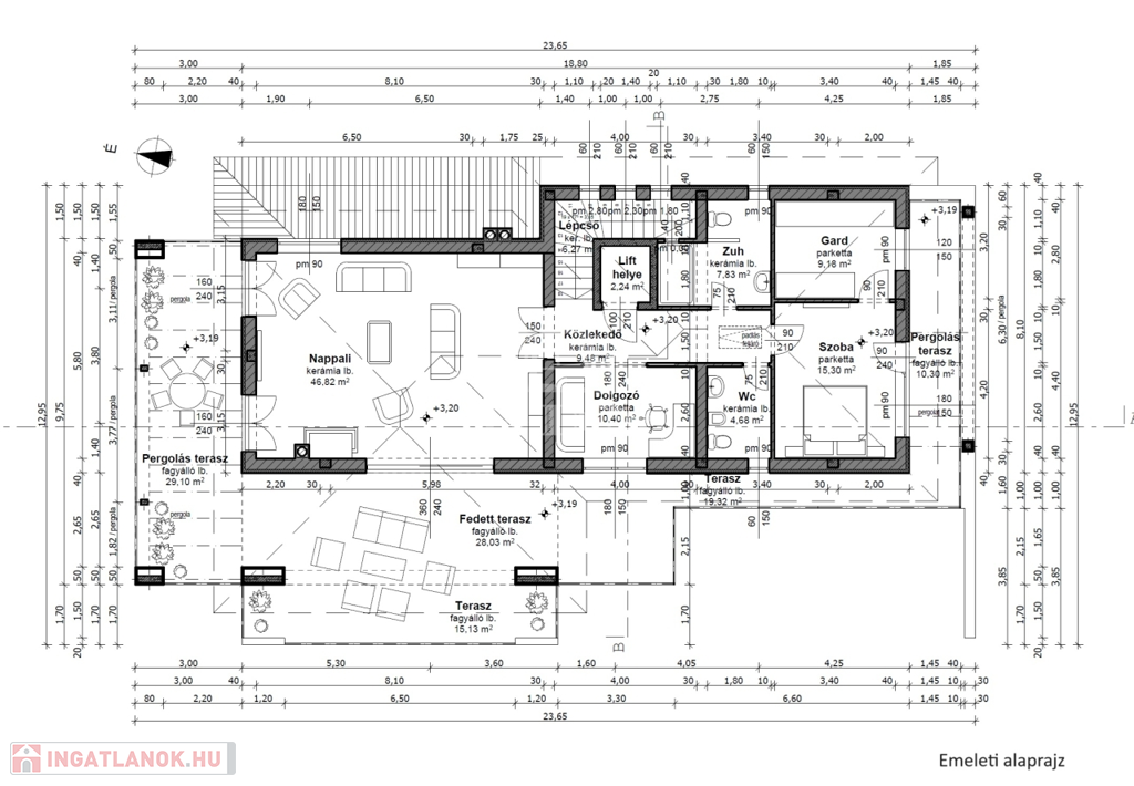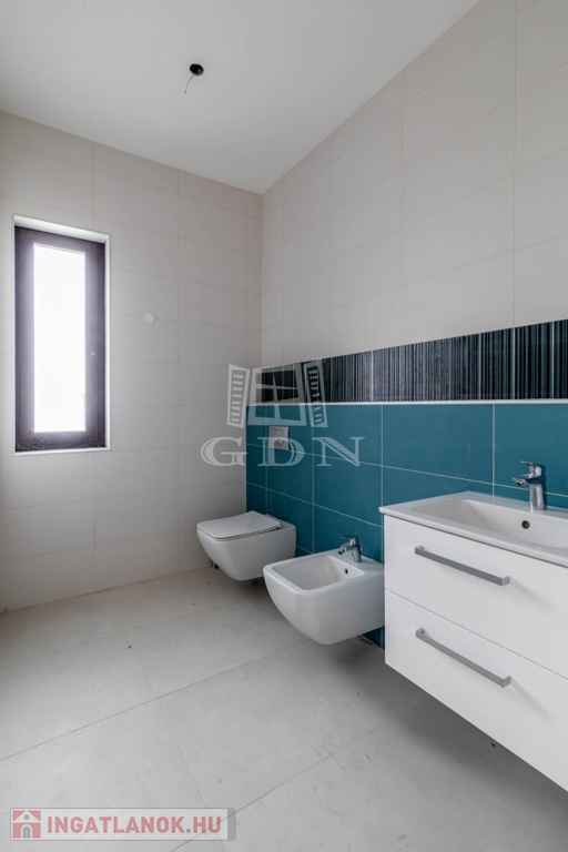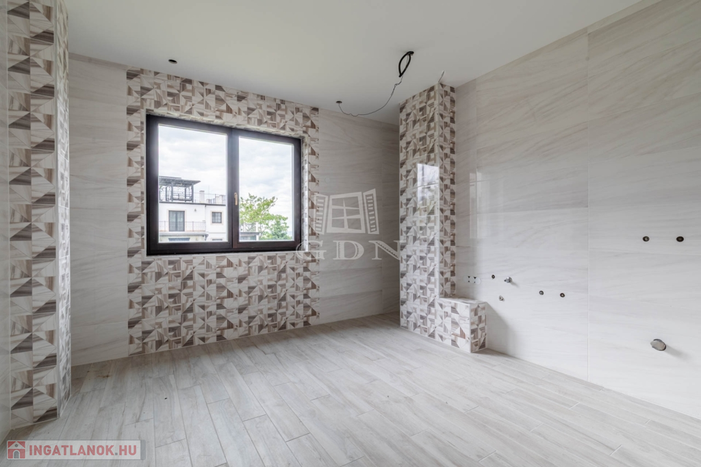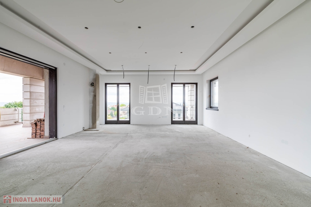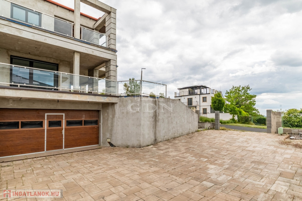 A 112 nm-es nettó alapterületű emeleten 1 nappali (kandalló előkészítéssel), 3 szoba, 2 fürdőszoba, valamint 101 nm-es részben fedett és pergolás körpanorámás terasszal.