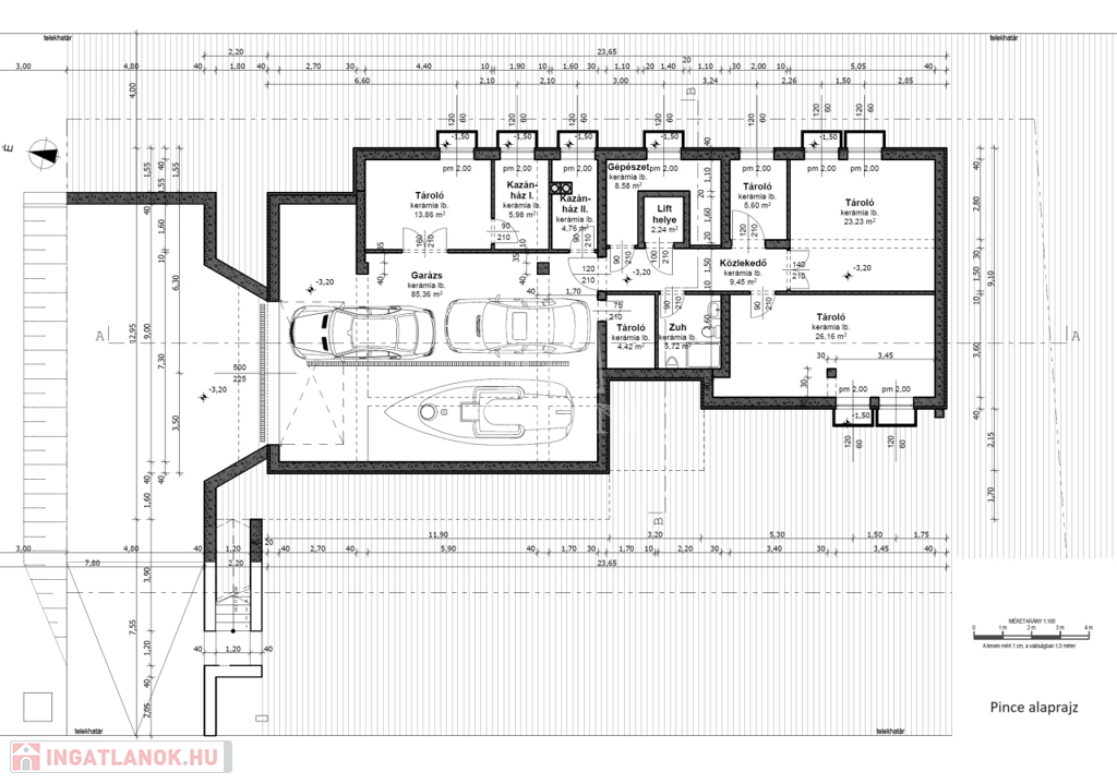 A 195 nm-es nettó alapterületű fűtött alagsorban található egy 85 nm-es egylégterű garázs, melyben 4 autó vagy akár 2 autó és 1 kisebb méretű hajó is kényelmesen elfér, valamint több tároló, vizes blokk, gépészeti és háztartási helység, továbbá egyéni igények szerint kialakítható kondi terem, mozi szoba, borterem. Fűtése korszerű gázkazán, padlófűtéses hőleadással, valamint másodlagos fűtésként vegyes tüzelésű kazán is kialakításra került, a ház minden szinten klíma kiállással rendelkezik, kiépített riasztórendszerrel ellátott. Az épület a lépcsőház mellett lift előkészítéssel (liftaknával) kiépített, mely mind a három szintet összeköti.